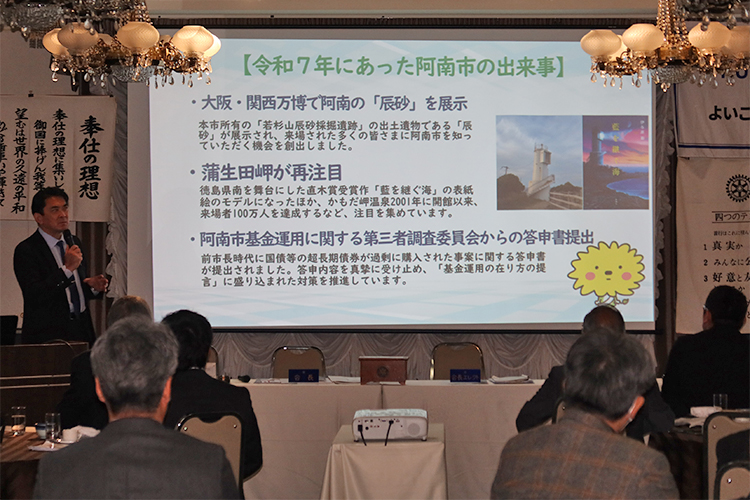 2026年初めての例会にご参加いただき誠にありがとうございます。毎年、第一回目のゲストとして、阿南市市長をお招きしております。今年も岩佐市長にご多忙の中、お越しいただいております。市長、どうもありがとうございます。後ほど、卓話をよろしくお願いいたします。