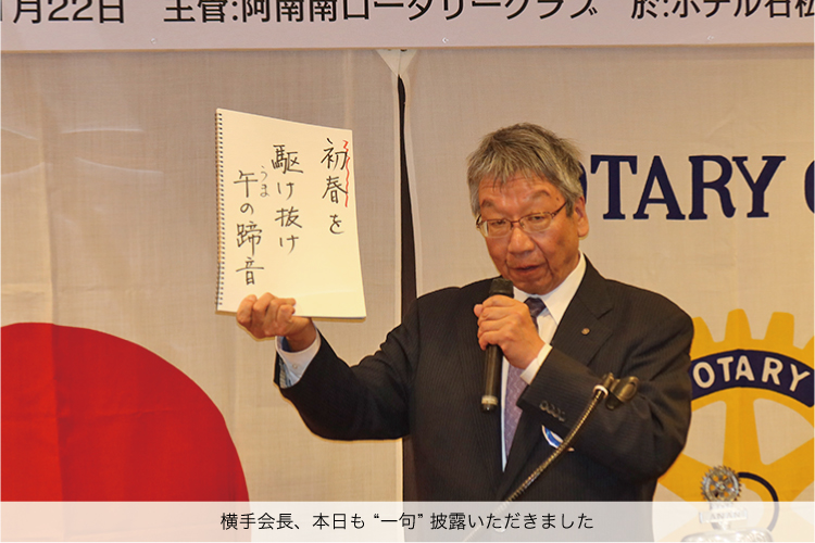 私のだれきった三が日、ゆっくりと休養できました。阿南ロータリーの会長として、折り返し地点を迎えております。前半を省みると、皆様のお力添えがあって行事をこなしてきたように思え、聊か自身の力不足を露呈したように思えます。しかし、私の実態はそこまでの男でございますので、後半戦も皆様の絶大なご支援をいただけますよう頑張って参ることをお誓い申し上げ、会長報告とさせていただきます。一輪車大会よろしくお願いします。