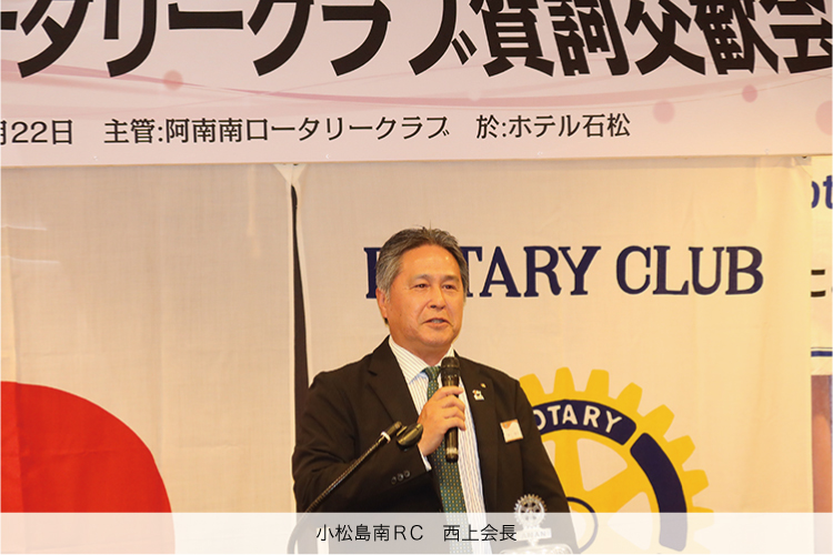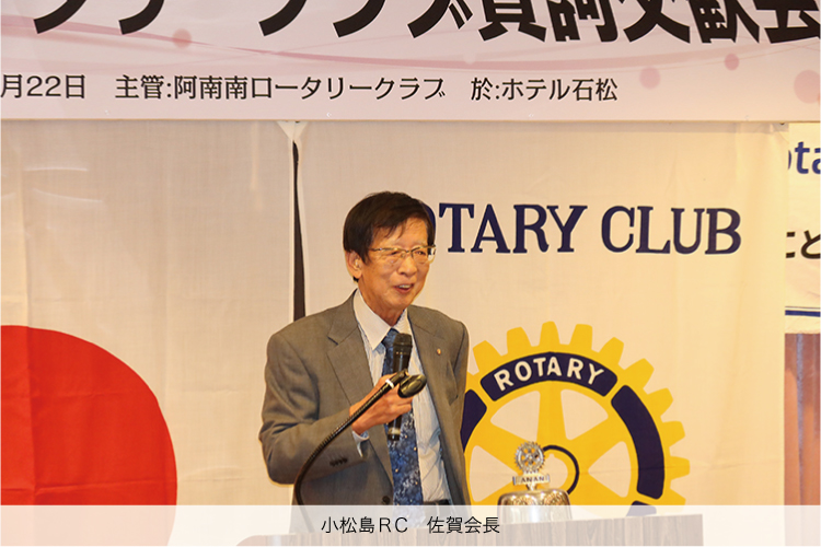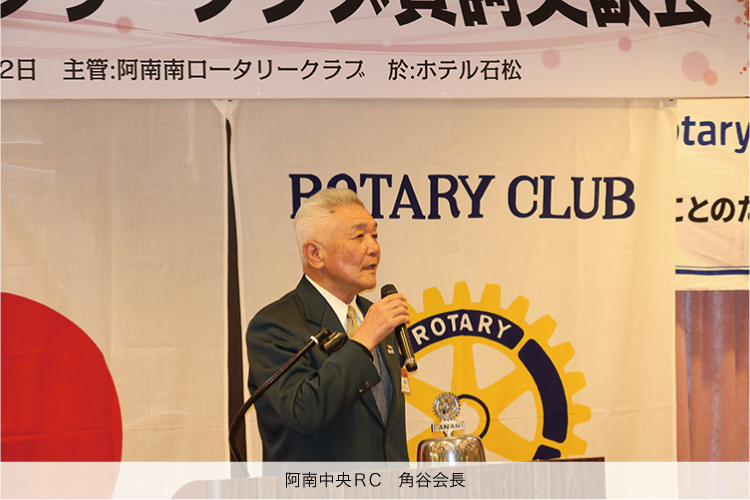 現在、この阿南市には3つのRCがございます。阿南南RC様、阿南中央RC様、そして阿南RC、それぞれの個性を生かし助け合い、切磋琢磨し、互いに睦み合いながら、「地域密着のロータリー」、阿南市の発展に寄与できるクラブを目指しともに歩んでまいりましょう。これからの阿南南ロータリークラブ様の益々のご発展と本日お集りの皆様方のご健勝ご多幸を御祈念申し上げます。 |