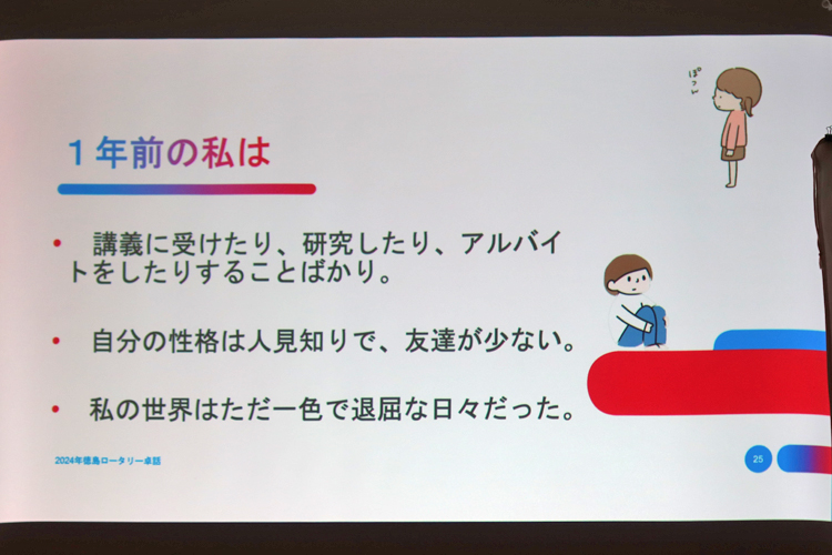 | 2024-2025短期交換プログラムの写真を4回に渡り掲載させていただきました。留学生の現地での生活が分かる画像でした。これらの画像全ては地区国際奉仕短期交換委員の藤﨑様(徳島プリンスロータリークラブ)のご協力で預かりました。ありがとうございました。 |